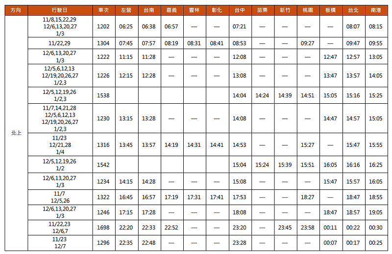 高鐵公司說明,本次短期增班計畫主要針對每週五、六、日等旅客購票踴躍時段增加班次。自11月7日起到1月4日為止,共9週,加開74班南下列車和73班北上列車。期間加開的夜間北上1698車次列車、1296車次列車僅開放第11和12車為自由座車廂,且抵達部分車站的時間將超過24時。