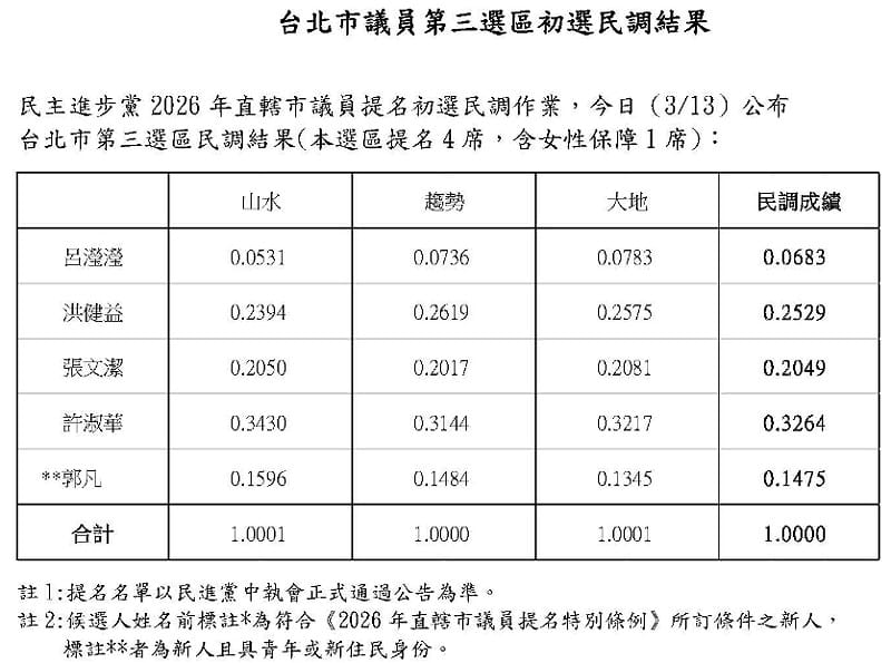 民進黨台北市黨部稍早公布民調成績,由許淑華以0.3264拿下最高,其他依序為洪健益0.2529、張文潔0.2049、郭凡0.1475以及呂瀅瀅0.0683。